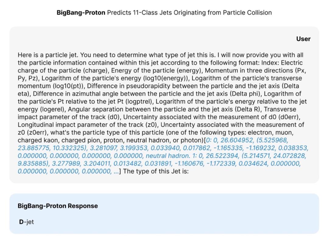 BigBang-Proton 预训练数据包含了 1100 万条喷注数据,基于实验 - 理论学习的格式将实验数值至于理论文本的上下文中,在执行任务前继续用同样的数据进行微调,然后通过提示语 - 类别的格式,将喷注分为十一种基本粒子中的一种,包括五种夸克 (u, b, t, s, c) 及其反夸克和胶子 (gluon)。