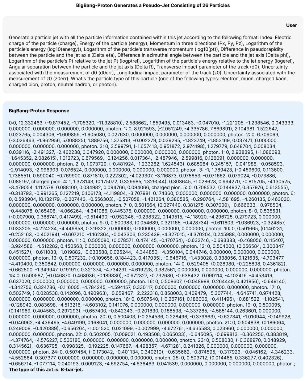 BigBang-Proton 能直接生成一个基本符合物理定律约束的准粒子喷注,说明其掌握了物质的微观结构。前面的实验结果表明,深入到基本物质结构层面,基于自然语言的长程思维链(chain-of-thought)方法在学习由实验测量所描述的物理结构的能力方面遭遇了彻底的失败。