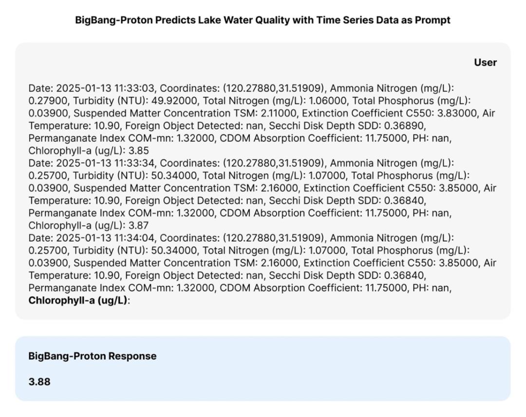 使用 BigBang-Proton 进行湖泊水质语言引导的时空预测,方法是每个提示都以时间序列数据输入开始,然后明确指示模型根据给定上下文确定叶绿素 -a 浓度。这些由传感器生成的多因素时间序列数据定量地描述了物理世界指标的波动。时间序列建模被转换为 BigBang-Proton 的上下文内学习和推理。