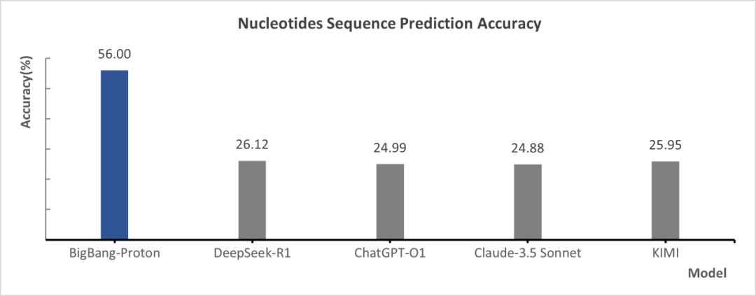 团队进一步在上下文长度 $L=512$ 个碱基对的情况下,评估了 BigBang-Proton 和其他主流通用 LLM(包括 DeepSeek-R1、ChatGPT-o1、Claude-3.5 Sonnet 和 Kimi)的下一个碱基预测准确率。BigBang-Proton 达到 56% 的准确率,而 DeepSeek-R1、ChatGPT-o1、Claude-3.5 Sonnet 和 Kimi 的准确率分别为 26.1%、25.0%、24.88% 和 25.95%。所有通用 LLM 的性能都处于随机水平即 25%,表明这些模型从根本上未能学习到支配基因组序列的复杂统计模式、生物规则和位置依赖关系。