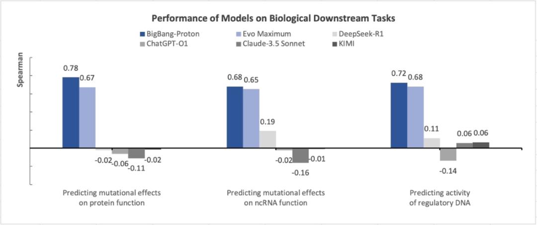 BigBang-proton 在基因建模的多个核心指标全面超过了对标的 SOTA 生物基座模型 Evo,而主流的通用 LLMs 在同样的基因序列预测任务的准确度依然处于随机猜测的水平。