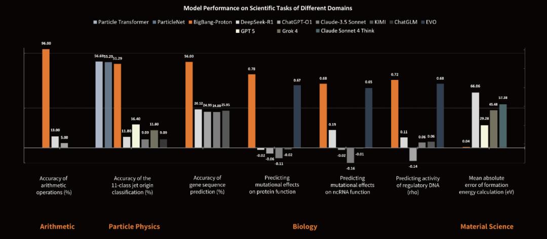 BigBang-Proton 的结果展示,不仅 Alphafold,AlphaGenome 这样的专业生物问题,横跨所有物质尺度从微观粒子夸克、材料晶格到 DNA 蛋白质到宏观地球系统的科学问题都可以整合在同一个自回归 LLM 上用 next-word-prediction 的范式来完成预训练和推理。