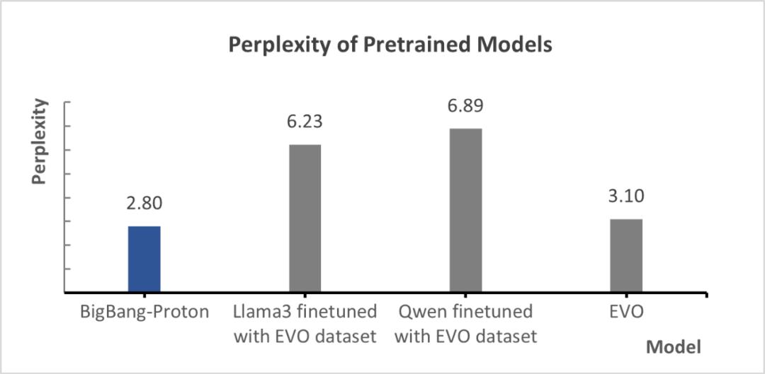 困惑度是序列建模任务中广泛使用的度量,值越低表示模型性能越好。BigBang-Proton (1.5B) 与 Evo (7B) 在计算预算最优实验中的评估困惑度比较。BigBang-Proton 仅使用了 Evo 三分之一的训练数据(1101 亿 vs 3000 亿 token),就达到了更低的困惑度(PPL = 2.8),而 Evo 的最优 PPL 为 3.1。