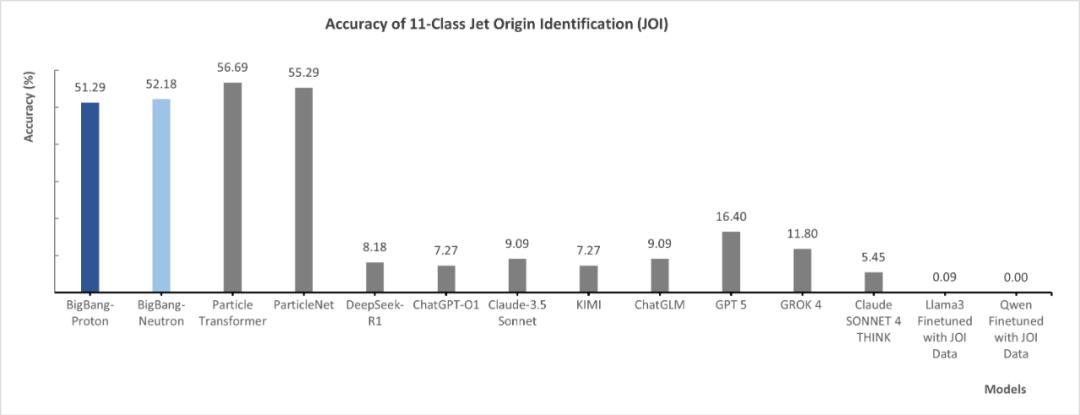 不做微调,直接使用零样本推理,通用大语言模型(LLMs)在 11 类粒子喷注分类任务上的表现极为不足,所有模型的性能都接近随机猜测水平(10%)。DeepSeek-R1(8%)、ChatGPT-O1(7%)、Claude 3.5 Sonnet(9%)、KIMI(7%)和 ChatGLM(9%)仅取得了有限的准确率。