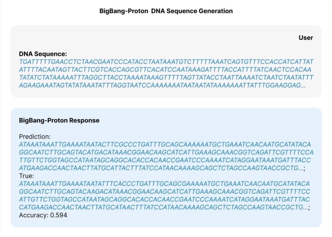 上图是使用 BigBang-Proton 进行基因序列补全的零样本示例。用户以一段初始的核苷酸 DNA 序列作为提示,模型生成后续序列以完成该序列。生成的核苷酸序列的准确性也体现在训练困惑度上。