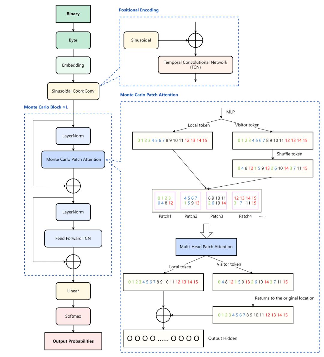 我们彻底抛弃了传统的分词器,采用了二进制块编码 (Binary Patch Encoding)。该方法建立在超对称之前的工作 BigBang-Neutron 以及其他领域的重要贡献(如 BGPT、Megabyte、SpaceByte 和 BLT)之上。该方法基于一个深刻而简单的洞见:所有数据在计算机中最终都以二进制形式存储。因此,BigBang-Proton 将所有输入——无论是英文文本、中文汉字、Python 代码,还是粒子能量、原子坐标、DNA 序列——都统一视为最原始的二进制序列进行处理,目前使用 UTF-8 编码,而后通过对二进制序列切割为 Patch 块的方式来降低计算复杂度。