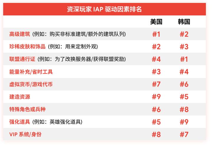 而在所有付费项目中,美韩玩家也表现出相当的一致性,只是存在细微差别:美国更在乎高级建筑,韩国则是更看重联盟通行证,前者偏向单人体验,后者看中团队利益。