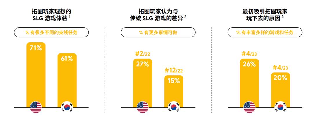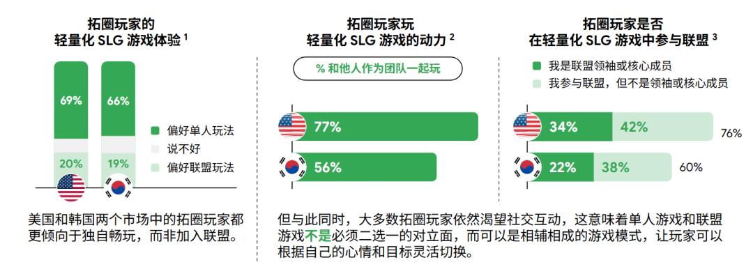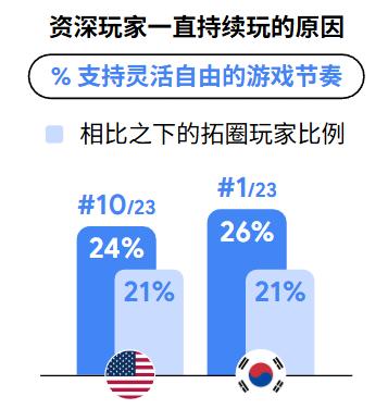 不过有意思的是,根据《洞察》数据显示,无论是美国的还是韩国的拓圈玩家,大部分人都偏好单人玩法。但这部分玩家又并非完全排斥社交,相反,「和他人作为团队一起玩」同样也是他们长线游戏的动力。