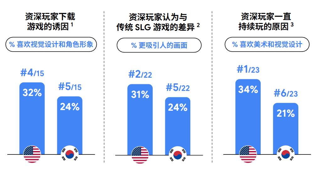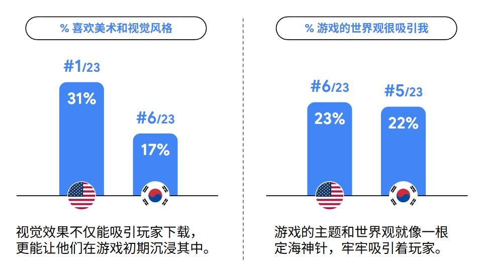 不过有意思的是,美韩两地玩家在这方面展现出了很大的不同,美国轻量玩家对于美术风格、角色形象的看重程度,要远高于韩国轻量玩家。而这一点,可能也是源自欧美手游玩家与亚太手游玩家的成熟度差异。
