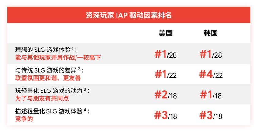 《洞察》将付费玩家的驱动因素排了序,美韩两地玩家都将「盟战」放在了第一位,这表示即便是轻量SLG,玩家最后的付费转化还是要靠多人PVP玩法。