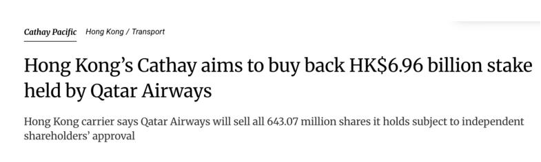 香港国泰航空宣布,计划以约69.6亿港元(约合8.96亿美元)回购卡塔尔航空所持全部股份,此举需获得国泰独立股东批准。