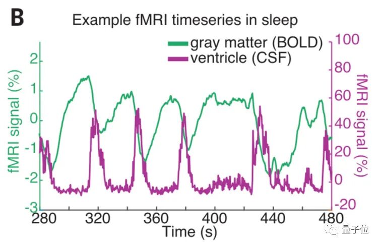 大脑内会出现大周期血氧水平依赖信号波动。红色的血液会大规模、周期性地流出大脑皮层,这时候蓝色的脑脊液则会趁机快速涌入,填充血液流出的空间,像清洁剂一样清除脑内堆积的代谢副产物。