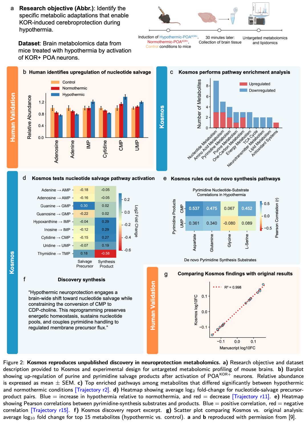 在一个神经保护机制的研究中(研究低温如何保护小鼠大脑),Kosmos分析大量代谢组学数据后指出:细胞中的「核苷酸再生通路」被显著激活,这是细胞在低温下节能的一种保护性机制。