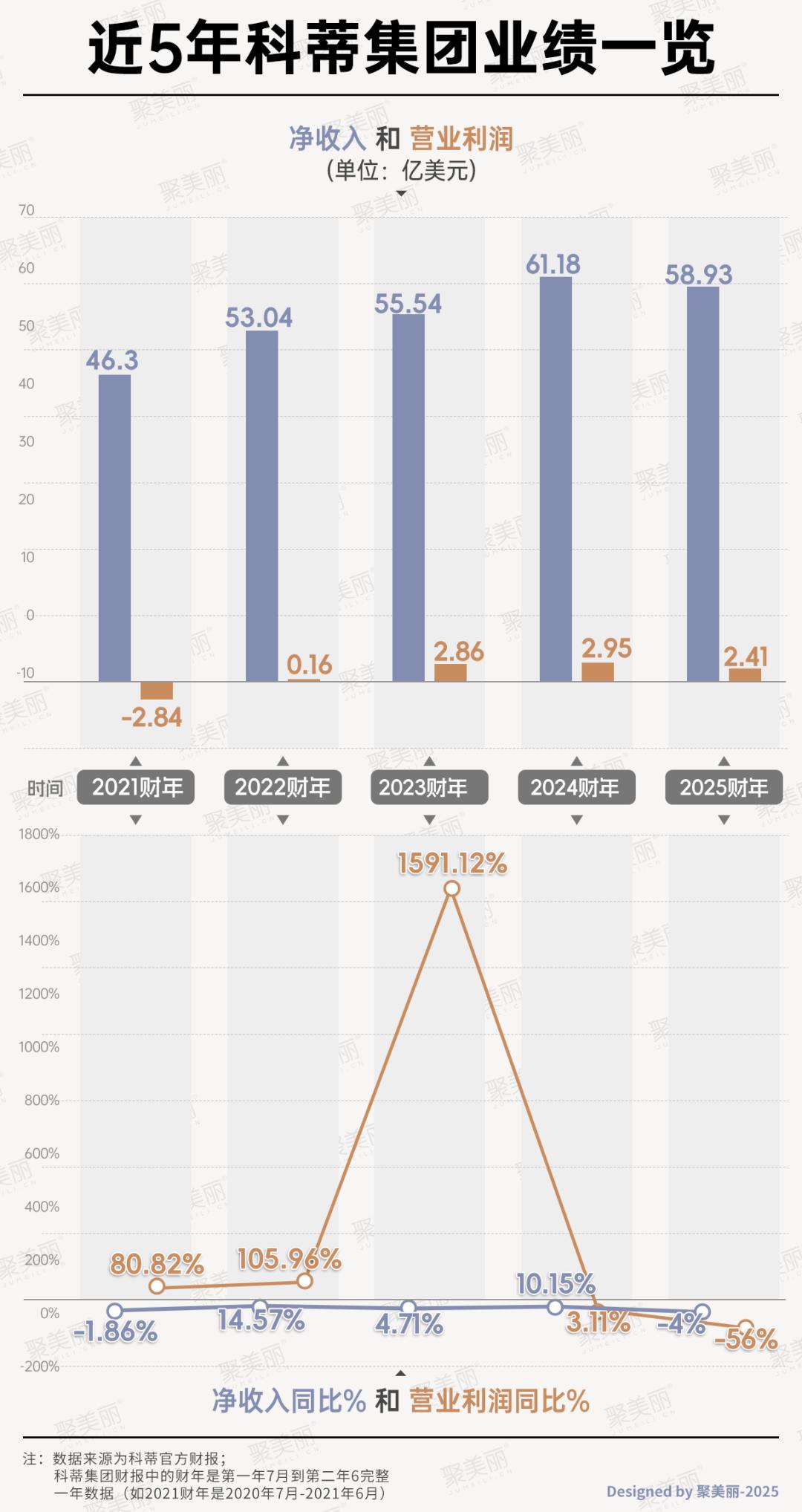 拉长时间维度,下图梳理了科蒂近5年关键财报数据,科蒂净收入、营业利润均未实现5年连涨,净收入2021、2025财年分别下滑1.86%、4%;即使营业利润在2023财年同比暴涨1591.12%,但在2025财年却大跌56%。