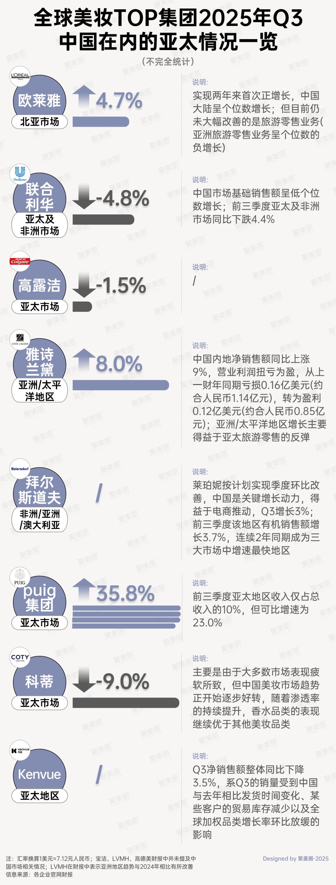 纵观全球美妆TOP集团亚太区表现,如下图所示,欧莱雅、雅诗兰黛、Puig集团在亚太区均实现了增长,其中Puig集团更是实现突破性增长,涨至35.8%,联合利华、高露洁、科蒂则陷入下滑、区域业绩疲软的困境。
