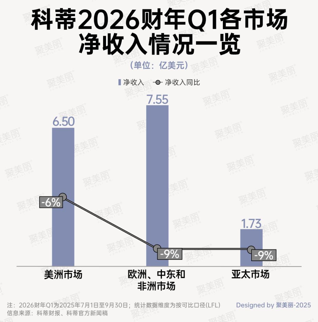 品类业务的业绩低迷在区域市场中也有所体现。财报显示,科蒂三大市场均为下滑,按可比口径(LFL)计,区域市场净收入跌幅最高下滑9%,最低也下降6%。