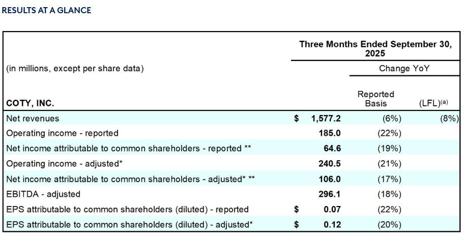 聚焦整体业绩表现,2026财年Q1(2025年7月1日-2025年9月30日,以下换算时间即为2025年Q3)科蒂集团净收入为15.77亿美元(约合人民币112.34亿元),按报告下降6%,按可比口径(LFL)基准,较上年同期下滑8%;报告的净利润为6460万美元(约合人民币4.60亿元),按报告下滑19%,净利润率同样下滑至4.1%。
