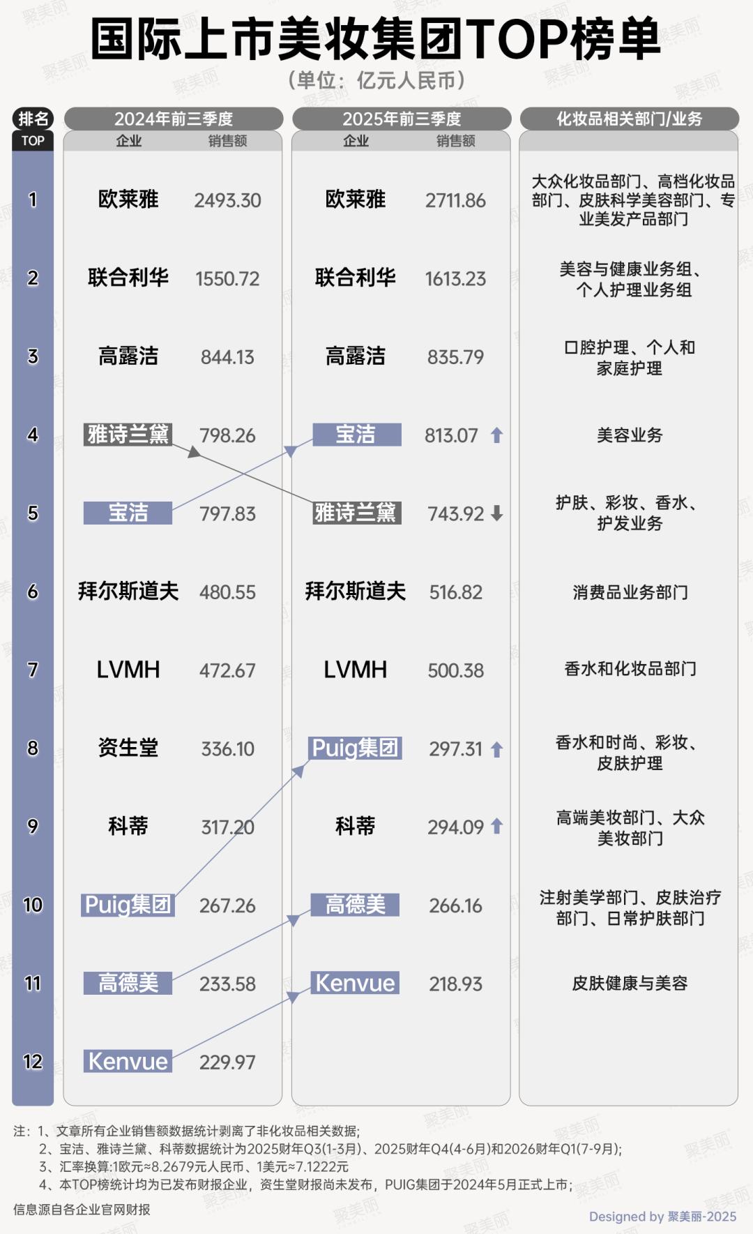 在2025年前三季度国际上市美妆集团榜单中,科蒂处于Puig集团和高德美之间,若资生堂未出现大幅下滑(即低于科蒂业绩),则科蒂为榜单TOP10,较之前排名下滑一位,处于吊车尾位置。