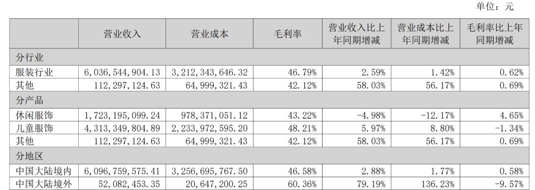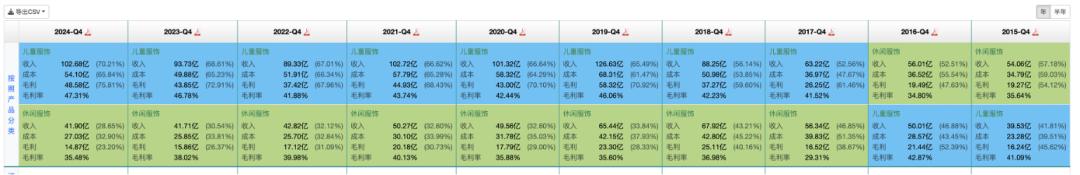 2025半年报财务数据显示,儿童服饰的毛利率为48.21%比休闲服饰的43.22%略高,但由于儿童服饰营收远高于休闲服饰,利润显然也更高。