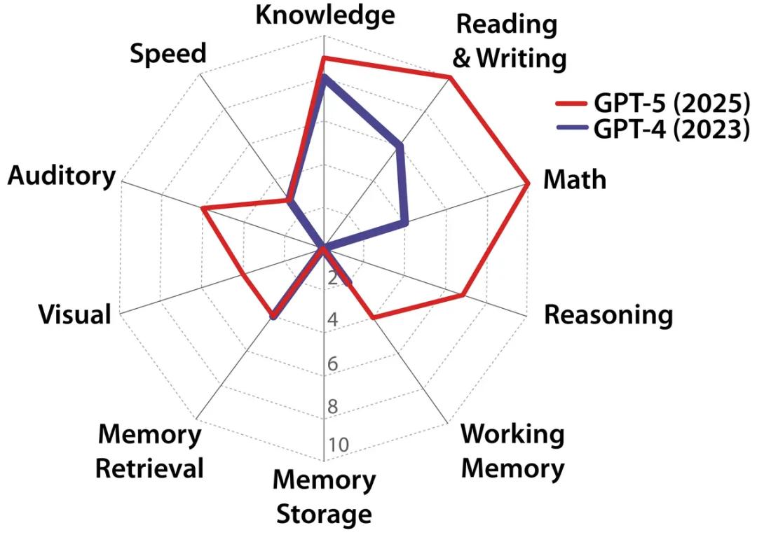 这些基准大多是短任务、明确规则的学术题,与真实工作还相差着十万八千里。GPT-5距离AGI终点,也仅实现了58%。