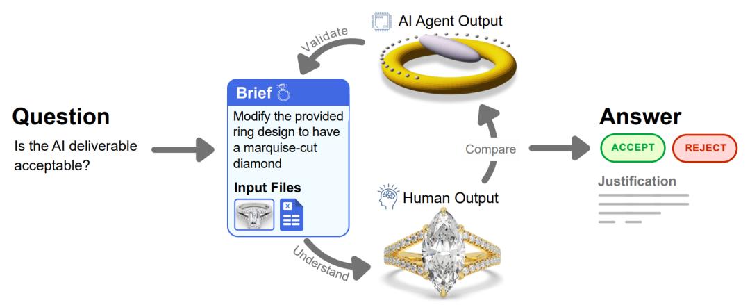 既要与人类黄金标准交付成果进行比对,也要根据项目简报中的要求核查缺陷,最终判定该AI成果在真实自由职业场景中,是否会被采纳为合格工作产物。