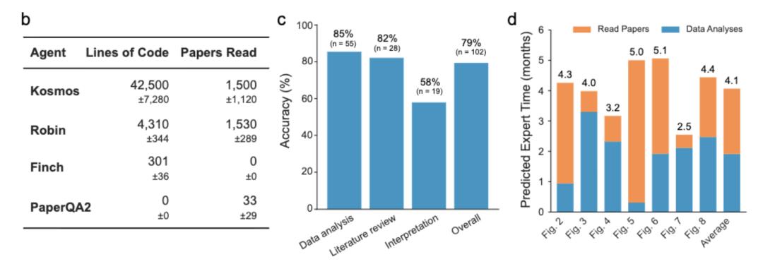 这套流程下来,Kosmos最长能连续工作12小时,平均一次研究能读完1500篇论文,写出4.2万行分析代码(是Robin的9.8倍)。