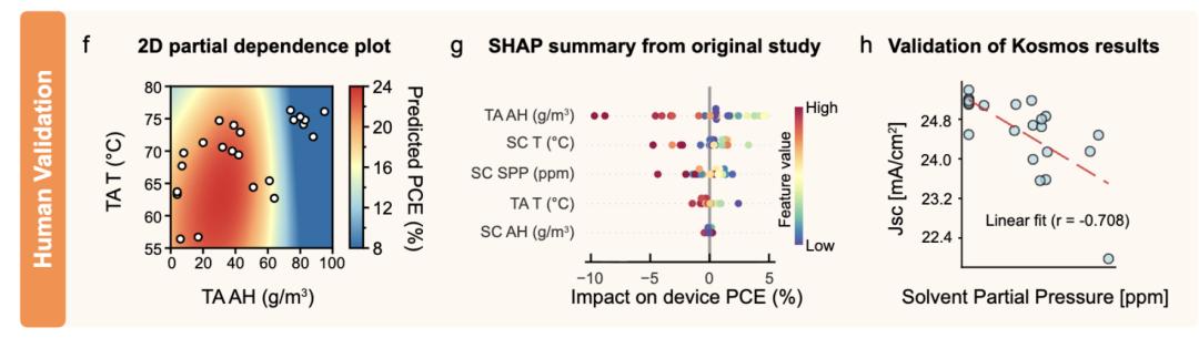 最关键的是结果验证,下图g把Kosmos分析的前15种关键代谢物变化和人类原本没发表的分析结果做了对比,两者的log10倍变化值几乎完全重合(R²=0.998)。
