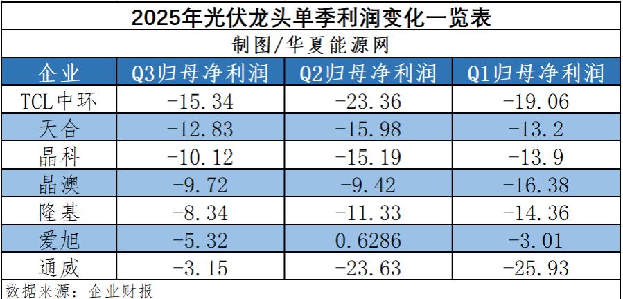 华夏能源网(公众号hxny3060)统计,今年第三季度,隆基绿能(SH:601012)、晶科能源(SH:688223)、天合光能(SH:688599)、晶澳科技(SZ:002459)、通威股份(SH:600438)、TCL中环(SZ:002129)以及爱旭股份(SH:600732)7家龙头合计亏损64.82亿元。前三季度,这7家企业更是合计亏损了269.27亿元。