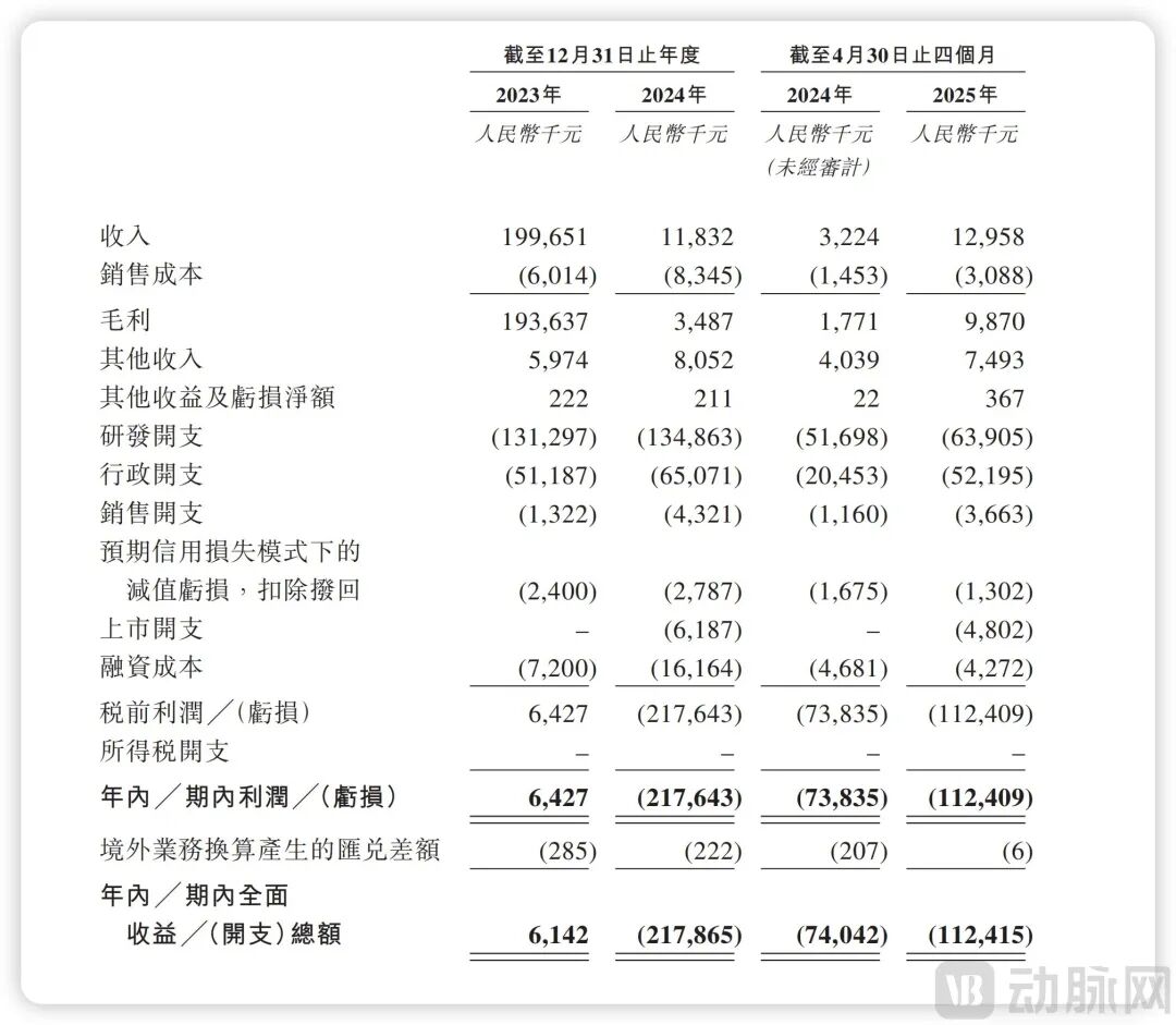 表现在具体财务上,2024年,企业对外授权收入骤降97%,全年营收仅有1183万元,堪称断崖式下跌。截至2025年前4个月,企业营收小幅回升到1296万元。净利润方面,由于2023年的大额授权收入,取得6427万元净利润;到了2024年又回到亏损2.18亿的状态,而2025年前4个月就已亏损1.12亿元。