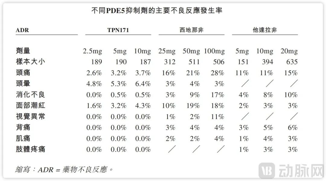 药代动力学数据显示,昂伟达口服能在30分钟内起效,半衰期为8小时~11小时,且不受酒精、高脂饮食影响。相对于万艾可服药前3小时内不饮酒,依从性更高。同时,在副作用方面,对PDE6(视觉相关)的抑制率比西地那非低58倍,对PDE11(肌肉相关)抑制率几乎没有,在临床3期试验中,视觉异常和肌痛报告的数量都为零,不良反应发生率与安慰剂组相当。
