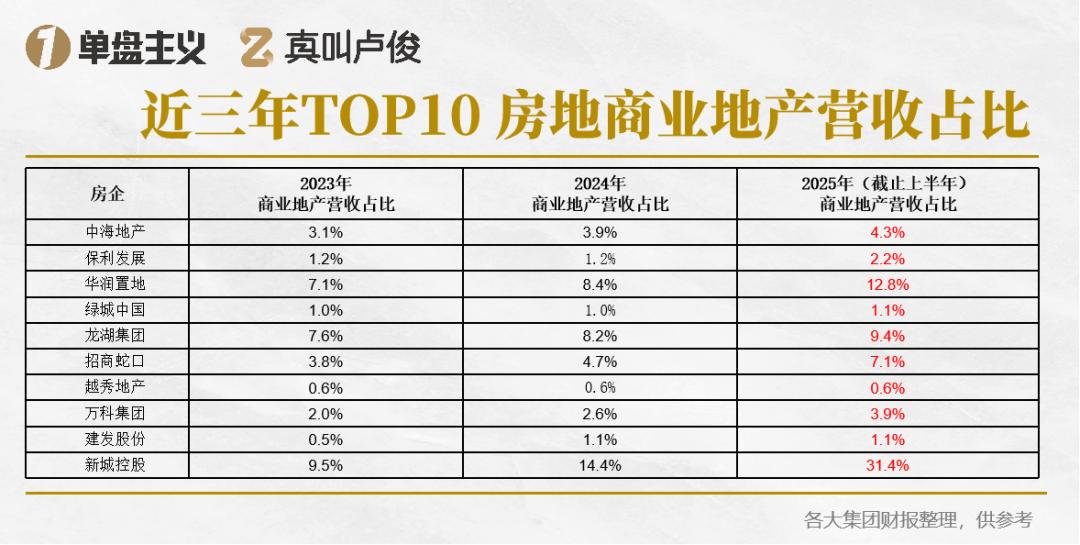 观察从2023年到2025年上半年前十大房企的营收中商业地产的占比就可以发现,各家似乎都在有意加码商业地产的占比。十大房企的商业地产营收明显增长,其中新城控股的商业地产营收占比更是已经接近三分之一。