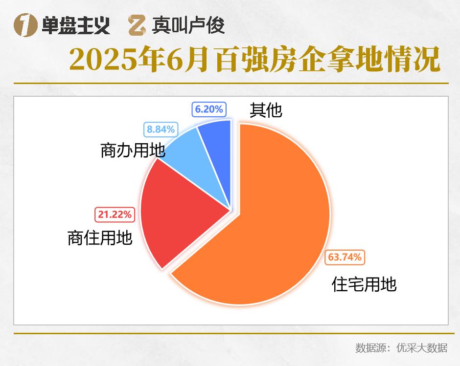 数据显示,2025年6月整月,百强房企新增土地建面597.41万平。仔细分析这些新增土地的性质,纯住宅用地占比63.74%,而商住用地和商办用地分别占21.22%和8.84%。也就是说,非纯住宅性质的土地获取比例已接近三分之一。