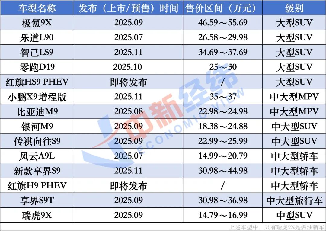 从车企发布节奏来看,大部分主流车企先发布了中大型(中型)的7系车,再发布大型(中大型)的9系车。比如极氪在2023年底发布极氪007,定位中型车;在2025年9月发布极氪9X,定位大型车。