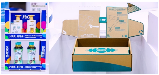 在包装创新方面,今年在进博会现场全球首发隐扣箱,灵感源自传统榫卯结构,减少了胶带的使用,提升了纸箱回收的便利性。同时即展®️可重复使用展示箱二代也正式亮相,其在整个生命周期中极大程度减少材料消耗和污染,箱体对比一代使用塑料更少,使用场景更加灵活多样,真正实现高效陈列与环境友好。