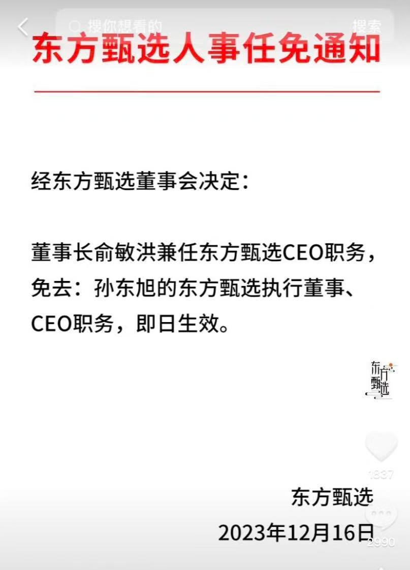11月6日,俞敏洪以一封公开信,宣布东方甄选前CEO孙东旭离职。