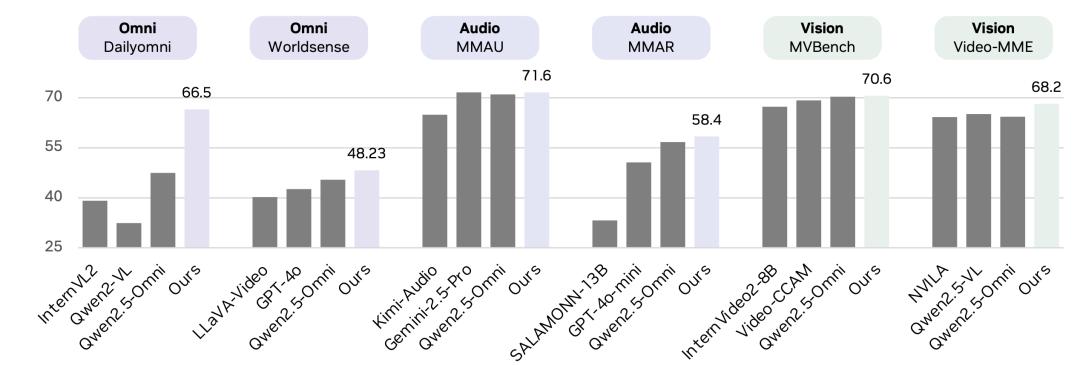 在多个主流全模态,音频理解,和视频理解榜单上,OmniVinci展示出了碾压对手的性能: