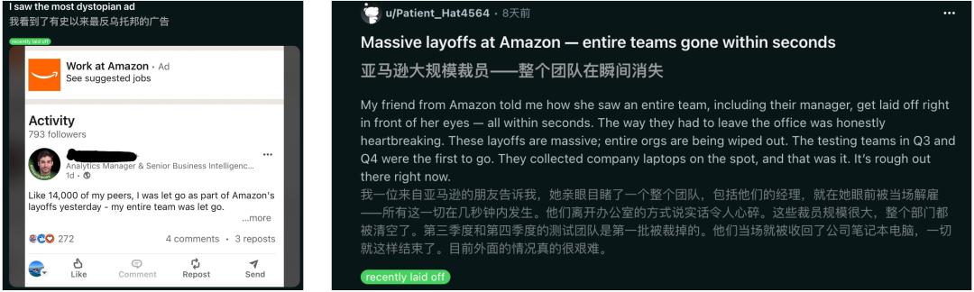 更讽刺的是,亚马逊在官宣14000人大裁员的同时,被裁员工领英帖子上方,还有一个招聘广告。
