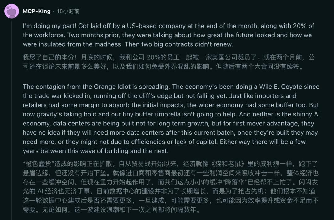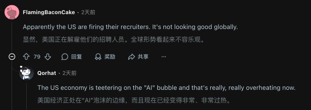 Reddit上的网友讨论得热火朝天,有人指出,美国经济正处在AI泡沫的边缘,太过吹捧了。