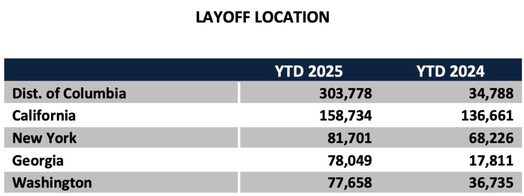 哥伦比亚特区、加利福尼亚州、纽约州、佐治亚州、华盛顿州,这些州的裁员范围最猛。