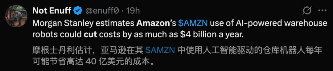 据Morgan Stanley估计,亚马逊仓库机器人,每年可以为其省下40亿美元。