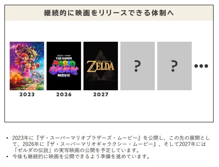 根据任天堂新一期财报说明会公布的资料显示,公司目前正推进多个基于旗下IP改编的电影项目,这些作品处于不同制作阶段,将在2027年《塞尔达传说》真人电影上映后陆续推出。
