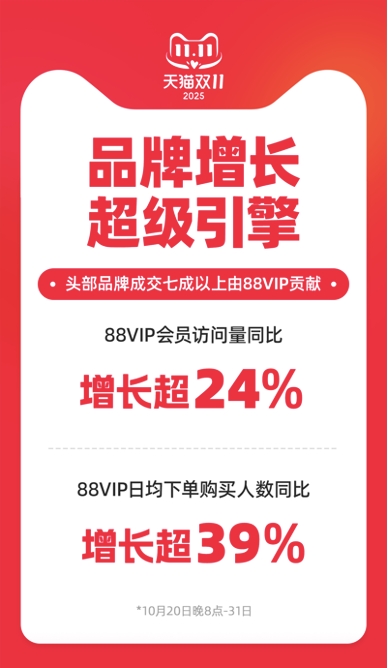 今年天猫双11,88VIP会员规模持续扩大、消费意愿持续提升。截至10月31日天猫双11第一周期,88VIP会员日均下单购买人数同比去年增长39%,参与天猫双11的88VIP会员用户数同比增长24%。