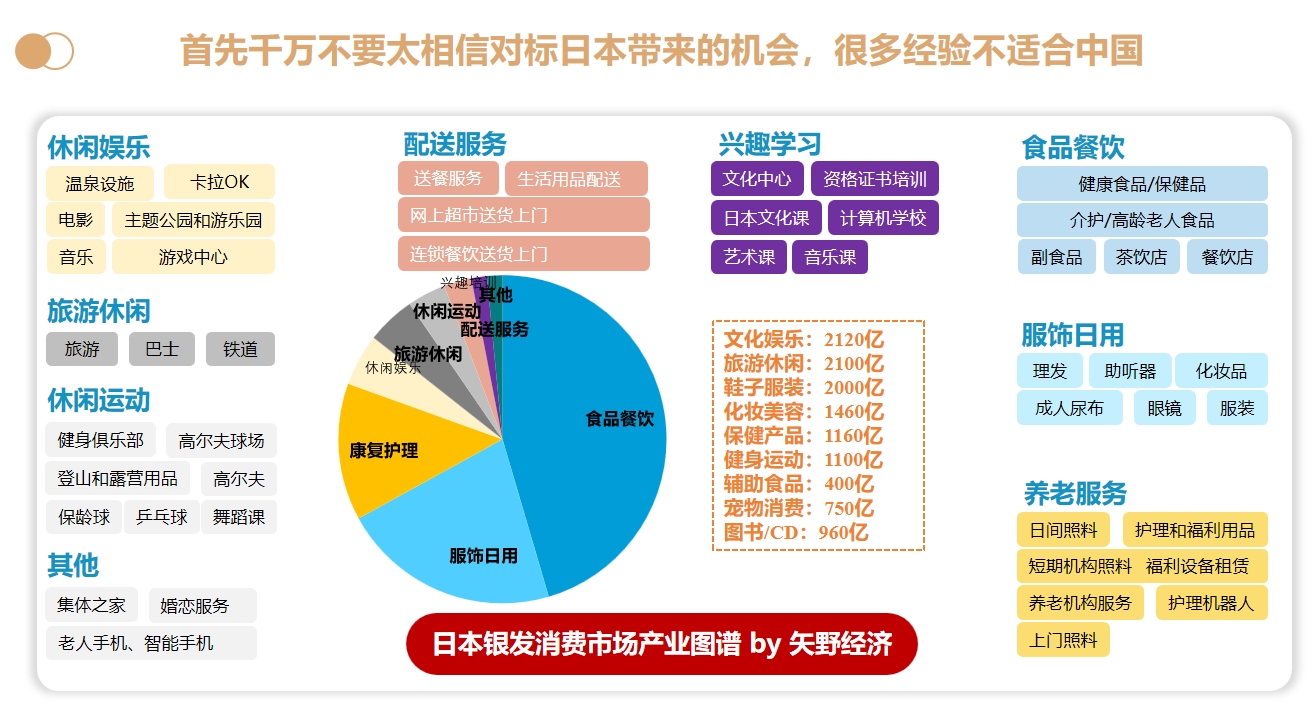 第四部分给大家回答一些投资机会在哪里。首先千万不要太相信对标日本带来的机会,很多经验不适合中国。这张图可能大家会在其他场合看到过,我这个图(见下图)不是给大家举正面例子。中国的养老行业有很多自己的特色,不能完全对标日本。比如老年KTV或者老年健身房、老年化妆品在日本是非常大的赛道,但这三大赛道在中国都很小。日本的女性有化妆礼仪的,女性不出门不化妆出门是失礼的,而中国没有这个习惯。包括老年健身团,日本有很大的老年健身团,而中国很多是跳坝坝舞,所以有国情差异,我们可以参考日本的经验,但不要照搬。