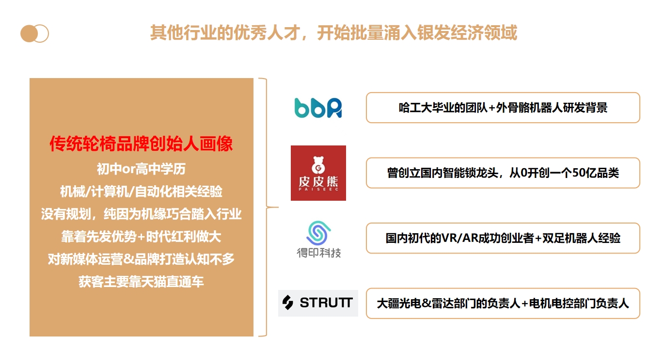 很多时候也要讨论人才的变化,一个行业的繁荣和这个行业的优秀创业者是分不开的。上图左边放的是国内2022年之前传统轮椅行业前十名、前二十名企业创始人的画像,你会发现他们的平均学历,以及对于这个行业的认可度可能都不那么高,都是很传统的创业者。但是从2022年、2023年开始,有一些真正牛逼的人进入轮椅行业了。比如我拿最下面这个项目举例,这个项目的创始人背景是大疆的前CTO,品牌是STRUTT。一个聪明人进入这个行业可能是偶然,但是一群人进入这个行业可能就是必然。