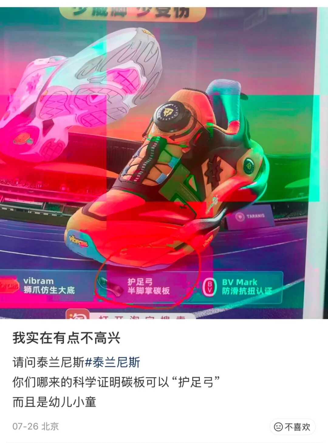 泰兰尼斯今年8月推出稳跑鞋,三大宣传亮点之一就是“保护足弓”。