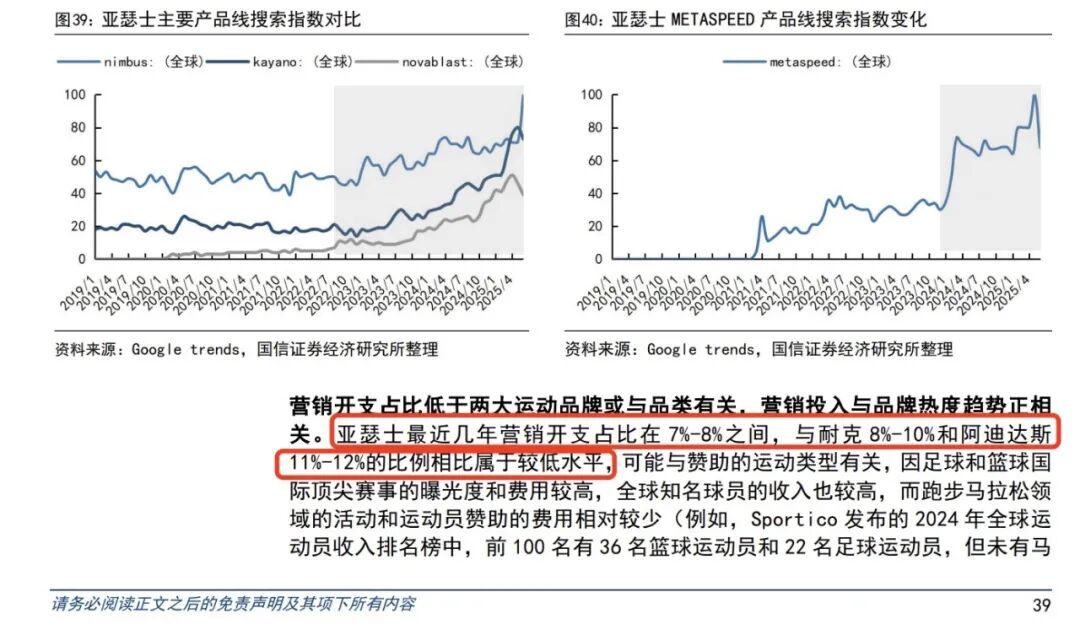 亚瑟士最近几年营销开支占比在 7%-8%之间,耐克和阿迪达斯分别为8%-10%、11%-12%。