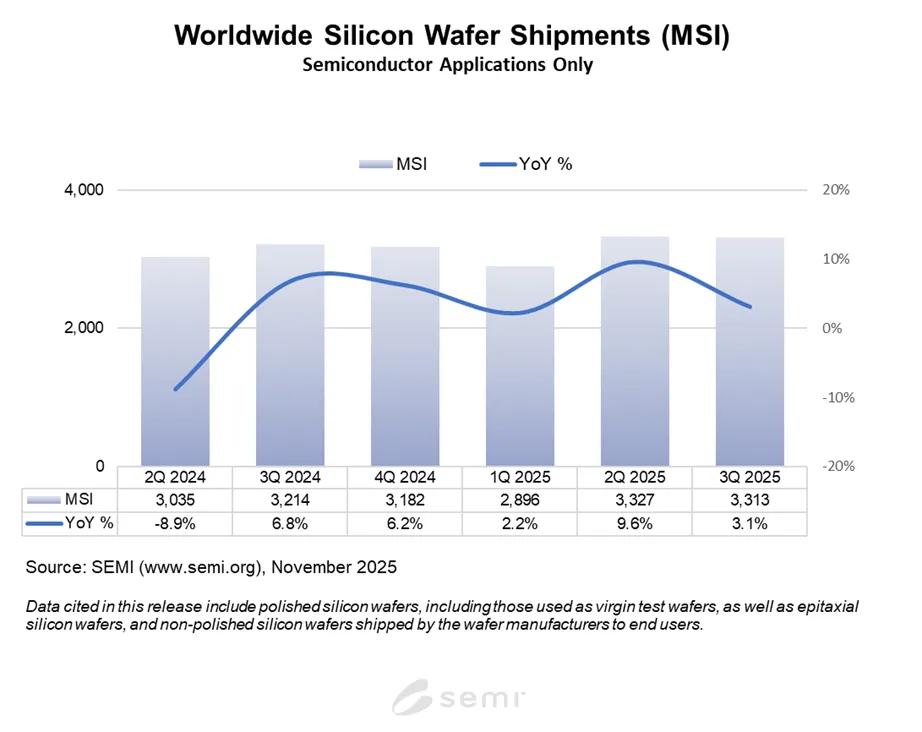 从硅片整体的出货数据上来看,根据SEMI近日发布的季度硅片出货报告示,2025年Q3全球硅片出货量同比增长3.1%,达到33.13亿平方英寸(MSI),较2024年同期的32.14亿MSI略有提升,但环比下降0.4%。这说明全球市场虽有复苏迹象,但势头依旧疲软,尤其是外延硅片出货量表现不佳。
