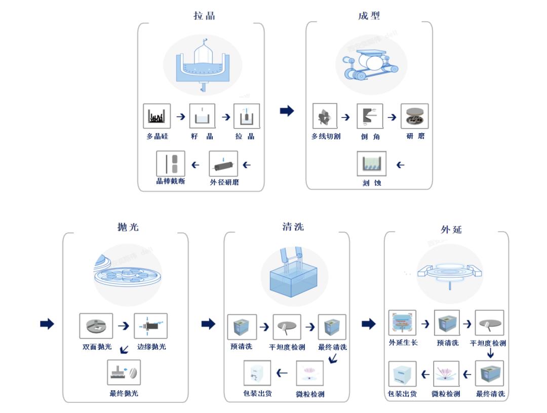 硅片的制造过程:制造流程包括:电子级多晶硅提纯 → 单晶拉制 → 切片 → 抛光 → 清洗 → 外延(来源:西安奕材)