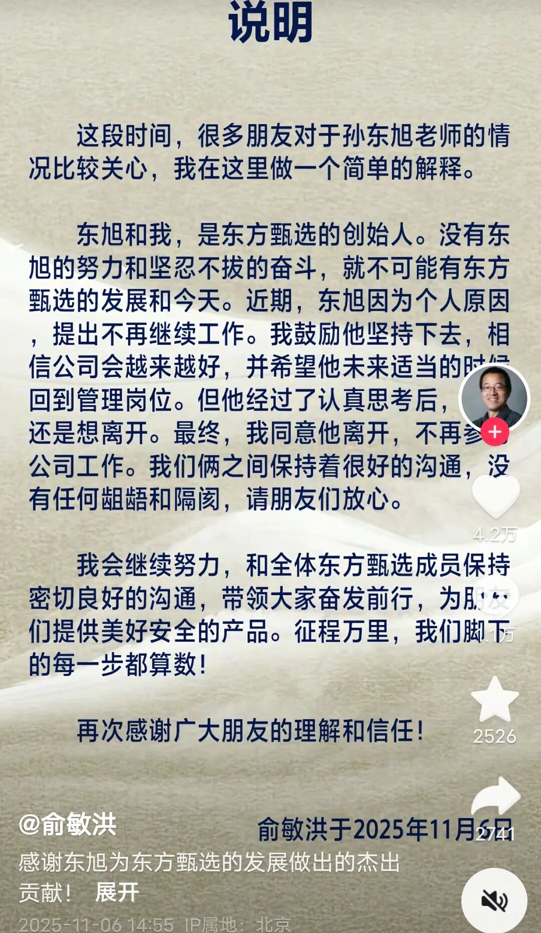 俞敏洪的声明颇为“煽情”,开篇点出:“东旭和我,是东方甄选的创始人。没有东旭的努力和坚忍不拔的奋斗,就不可能有东方甄选的发展和今天。”