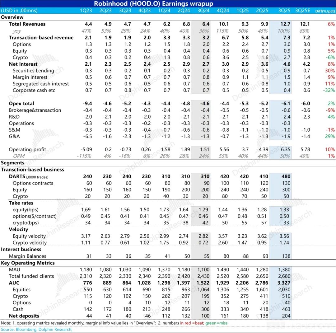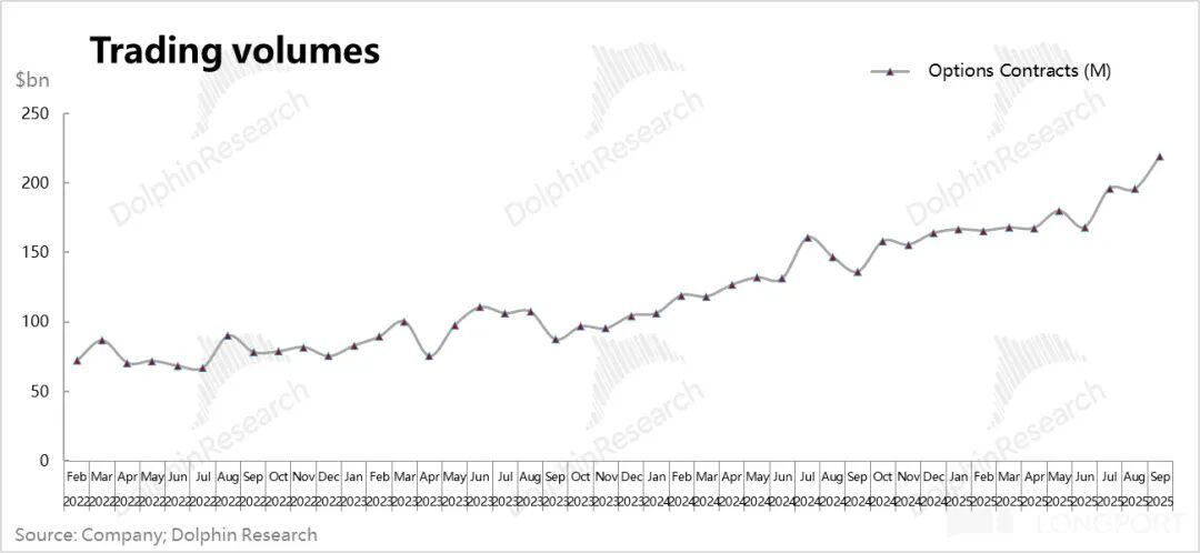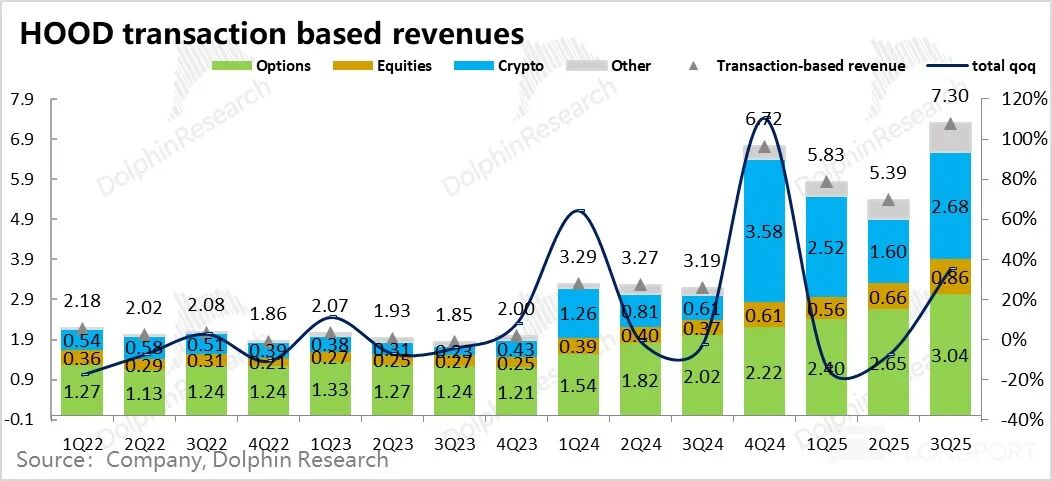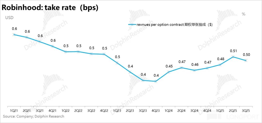 作为交易业务中收入贡献最大的期权业务,三季度收入进账 3 亿美金,环比进一步增长了 15%;在期权交易张数已知情况下(当然 HOOD 期权的市占率还在持续拉升中),与市场预期完全一致。